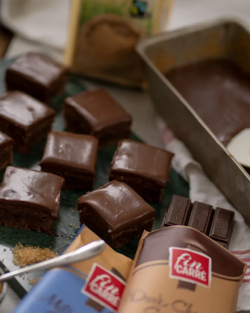 Fudge brownies med ljus chokladtryffel! Lyxa till söndagsfikat med dessa saftiga brownies toppade med krämig chokladtryffel gjord på Fairtrade-märkt choklad.