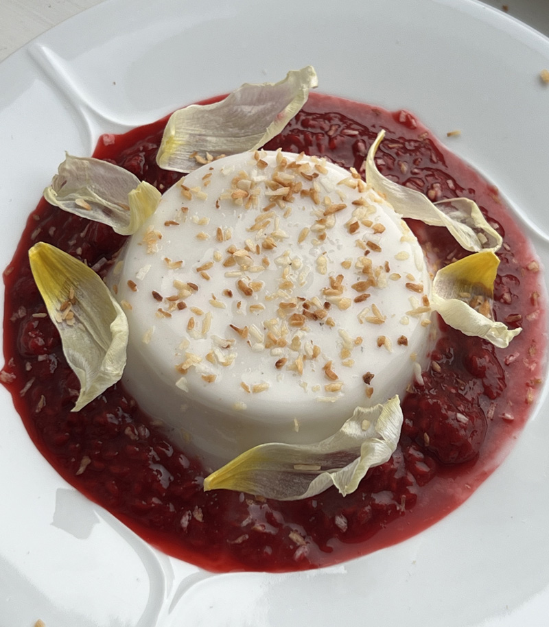 - Fördela hallonsås på fyra tallrikar, stjälp upp kokospannacottan, toppa med rostad kokos och ev tulpanblad.